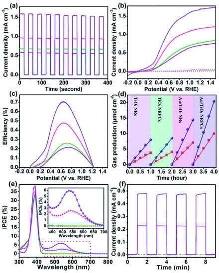 - Pu, Y.-C.; Wang, G.; Chang, K.-D.; Ling, Y.; Lin, Y.-K.; Fitzmorris, B.C.; Liu, C.-M.; Lu, X.; Tong, Y.; Zhang, J.Z.; et al. Au Nanostructure-Decorated TiO2 Nanowires Exhibiting Photoactivity Across Entire UV-visible Region for Photoelectrochemical Water Splitting. Nano Lett. 2013, 13, 3817–3823. [Google Scholar] [CrossRef]