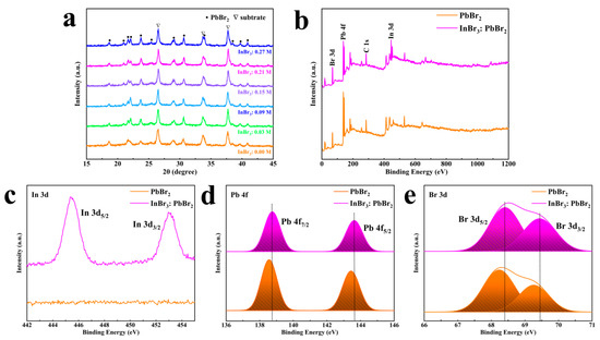 Figure 2. (a) X-ray diffraction (XRD) patterns of PbBr2 films by introducing different concentrations of InBr3. (b) X-ray photoelectron spectroscopy (XPS) spectra, and (c) In 3d, (d) Pb 4f, (e) Br 3d XPS core spectra of InBr3:PbBr2 film.