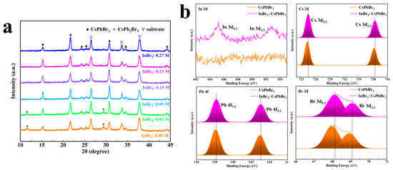 Figure 4. (a) XRD patterns of CsPbBr3 films by introducing different concentrations of InBr3. (b) In 3d, Cs 3d, Pb 4f, Br 3d XPS core spectra of InBr3:CsPbBr3 film.