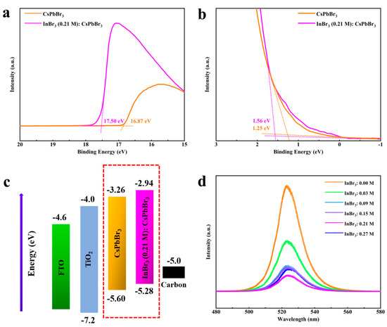 Subsequently, UV-vis Spectrometer, UPS, PL were used to characterize the cells with the FTO/c-TiO2/m-TiO2/CsPbBr3 structure. Figure S5a (Supplementary Materials) shows the absorption spectra of the CsPbBr3 with different concentrations of InBr3. The absorption edge of each perovskite film was at approximately 530 nm within the visible region, which revealed that the concentration change of the introduced InBr3 did not significantly affect the light absorption range of CsPbBr3. Correspondingly, the calculated bandgaps (2.34 eV) did not reveal obvious and meaningful changes (Figure S5b, Supplementary Materials). As the concentration of InBr3 increased, so did the film’s capacity to absorb visible light. This was mainly attributed to the phase-purity of the perovskite film and the full growth of crystal grains, which was beneficial to improve the short current density (JSC) of the cells. The mechanism of this phenomenon was mainly attributed to the partial substitution of Pb2+ by In3+ or In cluster [34,35]. Figure 5a,b present the UPS spectra of the pristine and InBr3 (0.21M):CsPbBr3 films. By formula valence band maximum EVBM = 21.22 eV − (Ecutoff − Eonset) [39,40], it could be calculated that the valence band (EV) of CsPbBr3 and InBr3:CsPbBr3 were −5.60 and −5.28 eV, respectively, which was ascribed to the rearrangement of electrons outside the Cs, Pb, and Br atoms after the incorporation of In3+ or In cluster [34,35]. Combined with Figure S5b, the corresponding calculated conduction band (EC) was −3.26 and −2.94 eV, and the energy band diagram of isolated semiconductors of the PSCs using carbon electrodes is plotted in Figure 5c [39,41]. For HTL-free PSCs, Ev of the perovskite should be deeper than the work function (WF) of the carbon electrode [39] so as to facilitate the extraction of photogenerated holes and reduce the energy loss of the holes during the transmission process [39]. Obviously, the incorporation of In3+ or In cluster effectively reduced the difference in interface energy levels, thereby facilitating the charge extraction and transfer and enhancing the photovoltaic performance of PSCs. In addition, the PL was conducted to analyze the carrier transfer behavior of CsPbBr3 and InBr3:CsPbBr3 films. As shown in Figure 5d, all perovskite films showed the typical emission band around 523 nm. InBr3 (0.21 M):CsPbBr3 film showed a strong quenching in contrast with the pristine and other CsPbBr3 films introduced with InBr3, which indicated that InBr3 could effectively inhibit the carrier recombination and enhance the charge extraction ability. The main reason behind this was that the defect density caused by the pinholes of CsPbBr3 films surface, and the impurity phase of CsPbBr3 films are obviously improved by adding InBr3, and the enhancement of the spatial symmetry of the crystal structure caused by partial substitution of Pb2+ by In3+ or In cluster [34,35,39,42].