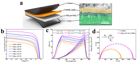 The HTL-free PSCs were synthesized based on the standard mesoscopic architecture of c-TiO2/m-TiO2/InBr3:CsPbBr3/carbon, and the cross-section of the complete device is given in Figure 6a. The current J–V characteristics of relevant devices under reverse scanning are presented in Figure 6b, the corresponding forward scanning curve is shown in Figure S6 (Supplementary Materials), and the key parameters including Jsc, Voc, FF, PCE, and hysteresis index (HI) are summarized in Table 1. The PCE of all devices with InBr3 introduced were better than that of the pristine ones, and all parameters showed a regular trend of first increasing and then decreasing with an increase of the concentration of InBr3 introduced. When the concentration of InBr3 was 0.21 M, the corresponding device exhibited the best performance. Compared with the pristine device, the PCE of InBr3 (0.21 M):CsPbBr3 device was significantly improved from 3.29% to 6.48% with the continuously increased JSC of 4.21 and 6.52 mA/cm2, Voc of 1.28 and 1.38 V, FF of 0.61 and 0.72, and HI of 0.25 and 0.03. When the InBr3 concentration was further increased to 0.27 M, the JSC of the device dropped by about 0.5 mA/cm2, while the Voc and FF did not change significantly, which was due to the deterioration of the InBr3:CsPbBr3 film morphology. The PEC of PSCs was determined by a variety of complex factors. According to the experimental results of SEM, UV-vis, UPS, and PL, the improvements of Voc and FF were due to the rise in the energy difference between the perovskite conduction band and electron transport layer, thereby reducing the energy loss of the holes in the transmission process. The improved Jsc was not only ascribed to the quality of the InBr3:CsPbBr3 film morphology or the increase in film coverage to absorb more photons to generate more electrons but also reduced vacancy defects in the optimized CsPbBr3 films to improve the charge extraction and transfer process after the incorporation of In3+ or In cluster. In addition, the smaller hysteresis of the InBr3:CsPbBr3 cells performed than that of the pristine device might be enabled by the passivation function of InBr3 to diminish the defects of Pb2+ and Br [34,35]. Figure 6c shows the external quantum efficiency (EQE) spectrum. The highest EQE value of 84% was achieved at the InBr3 concentration of 0.21 M, whereas the reference devices with less or excessive InBr3 concentration displayed lower EQE responses. This regular change was consistent with the results of J–V characteristics. Additionally, the integrated current density calculated by the EQE curve of each device was very close to the JSC, and the mismatch was less than 5%. Figure 6d demonstrates the Nyquist plots of pristine CsPbBr3 and InBr3 (0.21 M):CsPbBr3 devices measured at a reverse potential of 1.0 V and the corresponding equivalent circuit model. Table S1 (Supplementary Materials) also provides a list of the fitting values of the series resistance (Rs) and the charge recombination resistance (Rrec). After the introduction of InBr3, Rrec increased from 765 to 1152 Ω, which showed that the incorporation of In had efficient repression of carrier recombination due to the significantly improved film formation quality of perovskites, thus reducing the trap state density and improving carriers mobility [39].