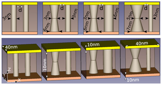 Simulated RRAMs. Four different LRS situations are considered, in all cases a double conductive filament was employed assuming a distance, d, between them (the bottom and top figures are the same in each case from different perspectives). The bottom electrode is assumed to be Si-n+ and the top electrode is made of Ni, the dielectric consists of HfO2. The conductive filament shapes employed are shown for the different cases under study, they are assumed to be metallic-like, formed by Ni atom clusters [24,55,80]. The physical parameters are the same employed in the simulation in [29].