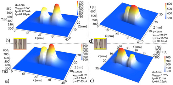In Figure 3, symmetric temperature distributions are observed in (a) and (b), corresponding to similar CFs, and therefore, to alike Joule heating effects. See the effects of the low thermal conductivity in the dielectric. According to Fourier’s law for heat conduction, the heat flux, q, is equal to the product of thermal conductivity, kth, and the negative local temperature gradient (). Since the HfO2 thermal conductivity is around 1 W/(K m), the temperature drops off rapidly around the CF. See also the effects of the dielectric-electrode boundary at z = 10 nm and z = 30 nm, the temperature reduction is different from what is seen in the CF perpendicular direction along the x-axis. The maximum temperature is obtained in the narrowest section for the symmetrical truncated-cone shaped CF, as seen in (c) and (d). At this point, the physical mechanisms behind RS are more active and, consequently, they trigger the CF rupture at this location. See the thermal connection between the CFs for the different shapes and distances in between; in this respect, in tree-branch shaped filaments, the destruction of the branches and the thermal and current redistribution in the remaining intertwined branches makes the reset a complicated process.
