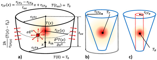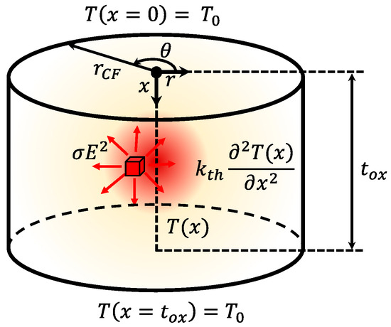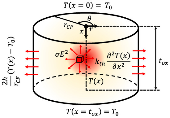 In the case under consideration, we assume a cylindrical CF with constant electrical and thermal conductivities. The boundary conditions are established at the extremes of the filament (x = 0 and x = tox, respectively, with temperatures T(x = 0) = T(x = tox) = T0, where tox stands for the dielectric thickness), see Figure 5.