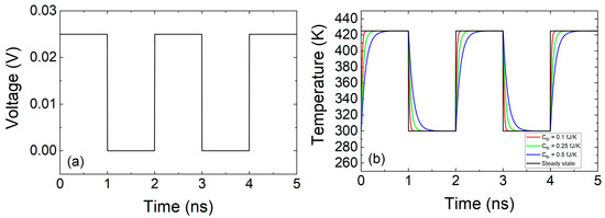 (a) Voltage applied to the device versus time, (b) Temperature versus time obtained for different values of Cth (assuming Rth = 2 × 105 K/W).