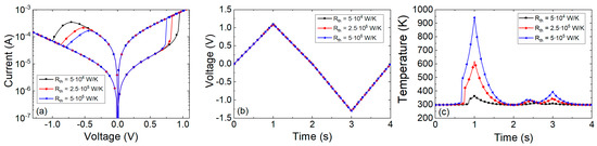 Several I-V curves were plotted in Figure 12 considering different thermal resistances. As can be seen, the main dissimilarities are found in the set and reset regions. For the Stanford model, the highest temperatures are found in the set process, see that the Joule heating is higher in the set process and in the interval of positive voltages above VSET. This is coherent with experimental findings that show that the Joule heating role is essential to describe the SET kinetics [81,99]. On average, these maximum temperatures achieved are in line with the estimations performed above for the thermal resistances considered. It is important to highlight the importance of the thermal resistance in the device design. See that higher Rth values lead to lower set and reset voltages to produce RS, and hence, lower power consumption. From this viewpoint, higher thermal resistances (i.e., devices showing a character thermodynamically more adiabatic with respect to the surroundings) might be more interesting. Since the heat flux from the CF to the metallic electrodes (operating these as heat sinks, a reasonable assumption, allows to calculate the heat flux with the material 3D thermal conductivity) could be in the same order of magnitude for different RRAMs, the dielectric could be the key (save the role of the contact thermal resistance). In this respect, we have to call the reader’s attention to the fact that the usual RRAM dielectrics are grown in nanometric layers; consequently, the real thermal conductivity due to phonon quantization is far from the values corresponding to the corresponding 3D dielectric materials, as it was shown in [100,101,102].