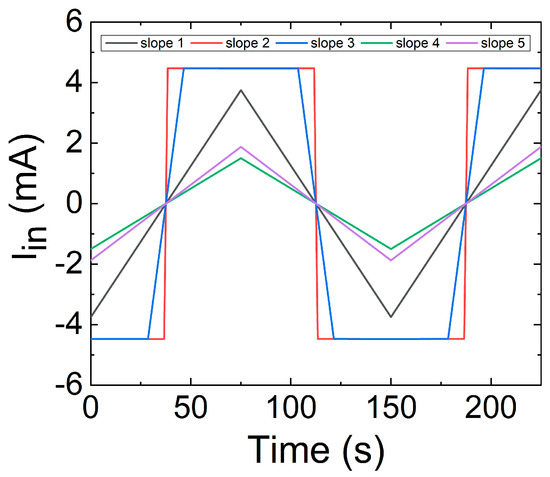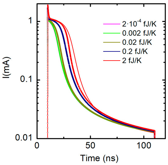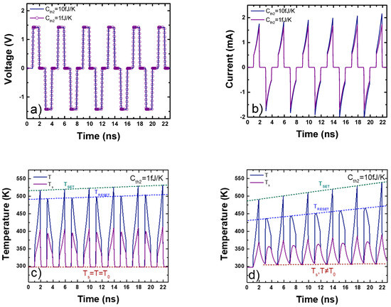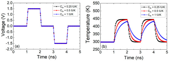 The role of the heat capacitance can be easily seen in Figure 11. For a pulsed voltage signal of amplitude (peak to peak)= 0.025 V, offset = 0.0125 V and f = 0.5 GHz applied in an ideal device whose resistance is assumed to be RRRAM = 1 Ω, the temperature can be obtained from Equation (27) for Rth = 2 × 105 K/W and Cth = 0.1 fJ/K (τth = 20 ps), Cth = 0.25 fJ/K (τth = 50 ps), Cth = 0.5 fJ/K (τth = 100 ps).