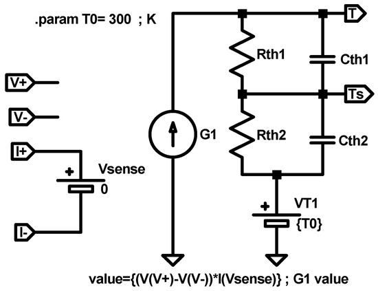 At circuit simulation level, Equation (19) can be implemented with the equivalent electrical sub-circuit shown in Figure 9. The heat dissipated power is represented by a dependent current source whose value is described as , where the voltage is determined by the two input sub-circuit terminals and , and the current is sensed by a null voltage source connected in series between the input terminals and . The thermal resistance is represented by an electrical resistance, , and the room temperature by a constant voltage source, , with a value that equals the room temperature (), in . The output sub-circuit terminal () provides a voltage that represents the device temperature T (in ).