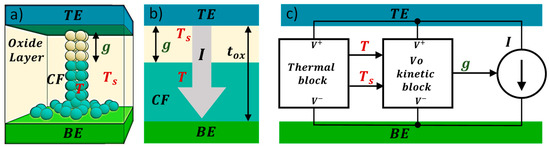 - A single temperature in the whole conductive filament [38,78] is taken into account (this means a strong simplifying approach). Some models for circuit simulation can account for two different temperatures [79], this is a good strategy since the key (higher) temperature at the CF narrowing, where the CF is ruptured, is decoupled from the main CF bulk temperature; this latter temperature does not increase in the same manner. See Figure 4c in [80], where the CF temperature along the dielectric is plotted for different voltages. It is clear that the temperature is much higher in the CF narrowing while it shows a different behavior for the main CF body. The model with two different CF temperatures is more complex, hence, this issue has to be taken into account when dealing with circuits including hundreds or thousands of components.