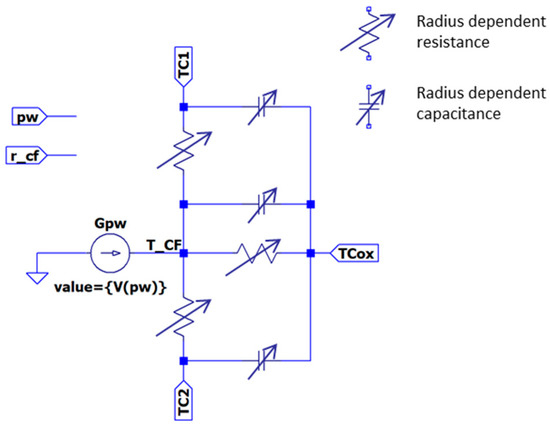 In this case, as before, the electric field is assumed constant, and the CF temperature is considered to be Tmax, as calculated in Equation (7). We will consider this the thermal model 2, TM2 (see the Verilog-A code in Table 1).