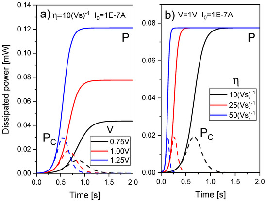 If we apply a time-dependent voltage, V(t), Equation (23) does not work. In this case, we have to solve numerically Equation (20). Assuming a new function, X(t) = T(t) − T0, we obtain,