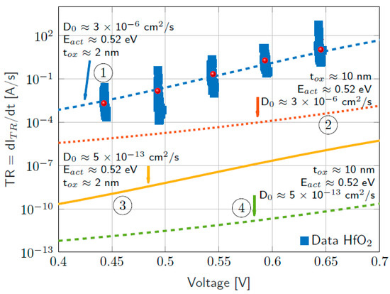 - Nigam, T.; Martin, S.; Abusch-Magder, D. Temperature Dependence and Conduction Mechanism after Analog Soft Breakdown. In Proceedings of the 41st Annual Symposium 2003 IEEE International Reliability Physics, Dallas, TX, USA, 30 March–4 April 2003; pp. 417–423. [Google Scholar]