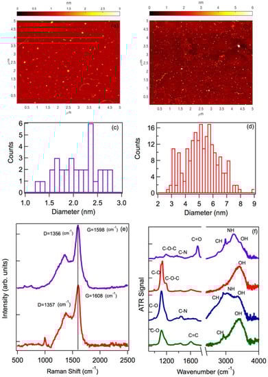 We carried out an extensive structural and morphological characterization of the CDs by AFM, Raman, and ATR measurements. The resulting data highlight both similarities and differences between BU and TD nanodots. Figure 1a,b shows the AFM images obtained from two representative samples, obtained by the two methods, after SEC or dialysis. While both images clearly show the presence of nanoparticles confirming the efficient production of CDs through both synthesis routes, their size distributions, plotted in Figure 1c,d, are quite different. It can be seen that the BU nanoparticles featured an average size of about 2 nm, whereas the top-down nanoparticles showed a much larger average size, about 5 nm. The difference is justified by the different synthetic approaches. Indeed, BU synthesis proceeds through the carbonization of sub-nanometric molecular precursors, from which the reactive and growth processes only allow for the formation of relatively small carbon nanodots. In contrast, top-down synthesis begins from much larger precursors, in this case <100 nm graphite carbon nanoparticles, which are broken up into CDs by the reactive process, but only up to a certain extent. Both size distributions are quite broad, confirming a high structural inhomogeneity typical of most CDs, a property which seems to be independent of the synthesis route.