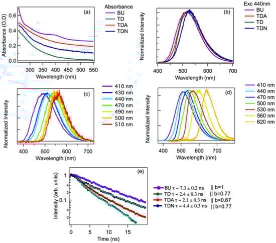 All the types of carbon dots emitted appreciable fluorescence under excitation across the visible range. In addition, the quantum yield (QY) for the four systems examined was calculated, exciting the samples at a wavelength of 440 nm, obtaining 46.4% for BU, 6.1% for TD, 9.2% for TDA, and 8.5% for TDN. Thus, as is generally known [,], the QY of BU-CDs is much higher than TD-CDs, and the QY of the latter can be enhanced by passivation. At a first glance (Figure 2b), in all samples the fluorescence appears as a broad band with maximum efficiency in the green when excited in the blue. Remarkably, very little differences appear among all samples when excited at the same wavelength (Figure 2b): in particular, the emission peaks at 515, 523, 524, and 526 nm for BU, TDA, TD, and TDN, respectively.