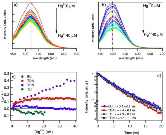 Emission spectra under excitation at 440 nm of the (a) TDA and (b) BU samples in aqueous solution in the presence of increasing concentrations of Hg2+ ranging from 0 to 40 µM. (c) Stern–Volmer quenching plots of the integrated emission under excitation at 440 nm of BU, TDA, TD, and TDN samples at different concentrations of Hg2+; I0 and I represent the emission intensity at zero and non-zero concentrations of Hg2+, respectively. (d) Excited-state decay kinetics of the emission under excitation wavelength of 440 nm of BU, TDA, TD, and TDN samples in the presence of the same concentration of 40 µM mercury.