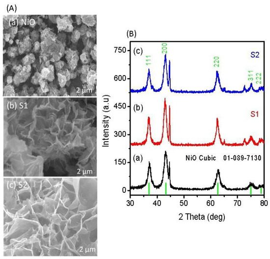(A) SEM images of (a) pristine NiO, (b) sample 1, and (c) sample 2; (B) XRD diffraction patterns of (a) pristine NiO, (b) sample 1, and (c) sample 2.