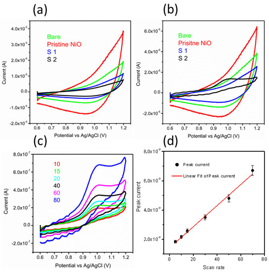 (a) CV curves of bare GCE, pristine NiO, sample 1, and sample 2 in an electrolytic solution of 0.04 M BRB buffer of pH 2 at a sweeping rate of 50 mV/s; (b) CV curves of bare GCE, pristine NiO, sample 1, and sample 2 at a sweeping rate of 50 mV/s in 20 nM MTX prepared in a 0.04 M BRB buffer of pH 2; (c) CV curves recorded for sample 2 at different scan rates of 15, 15, 20, 40, 60, and 80 mV/s in 20 nM MTX; and (d) A fitting of peak current versus different scan rates.