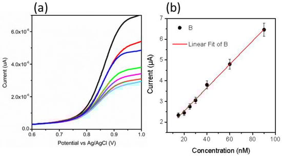 (a) LSV curves measured at 50 mV/s for different concentrations 15–90 nM of MTX in a 0.04 M BRB buffer of pH 2 and (b) linear plot of oxidation peak current versus different concentrations of MTX.