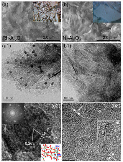For Co- and Ni-Al2O3 nanosheets, the onset temperatures in the second run were observed to be slightly lower than those in the first run. However, the other samples commonly showed higher onset temperatures in the second run, compared with the first run. This indicated that, for the latter, the catalytic activity became somewhat lower after the first run. The lower catalytic activity appeared to be mainly due to a change in crystallinity and lower catalytic-active sites.