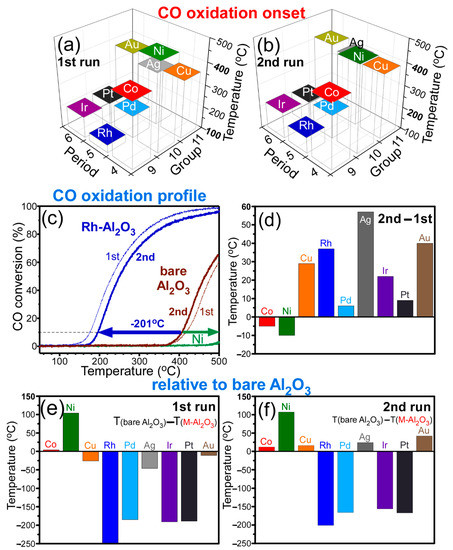 Figure 5e,f show the relative CO oxidation onsets (T