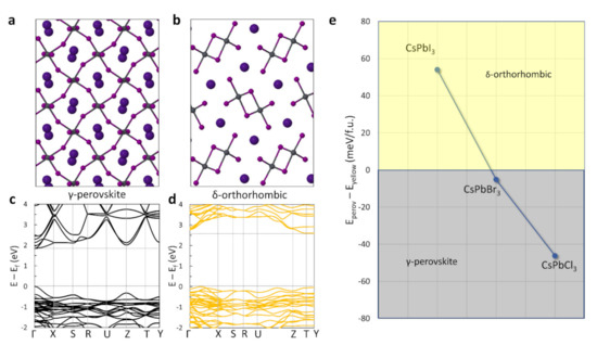 - Sutton, R.J.; Filip, M.R.; Haghighirad, A.A.; Sakai, N.; Wenger, B.; Giustino, F.; Snaith, H.J. Cubic or orthorhombic? Revealing the crystal structure of metastable black-phase CsPbI3 by theory and experiment. ACS Energy Lett. 2018, 3, 1787–1794. [Google Scholar] [CrossRef]