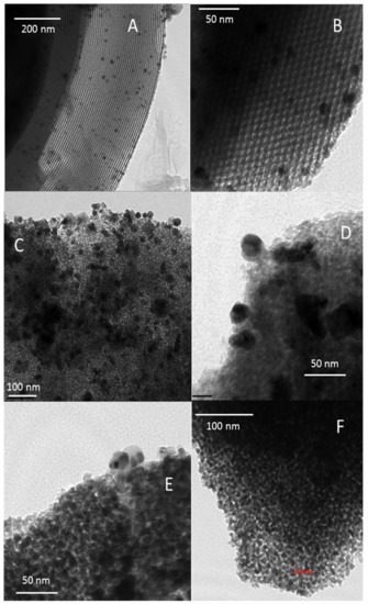 For the silver-impregnated alumina and ceria materials (Figure 3C–F), the silver nanoparticles are bigger and less homogeneously distributed on the support surface. This is not surprising considering the absence of internal porosity and lower specific surface area for ceria and alumina supports in comparison with SBA-15 silica and Y zeolite. Hence, such characteristics are expected to promote the agglomeration process of silver. Particularly, the γ-alumina support (Figure 3D) is constituted by crystallites having an irregular morphology and a size of a few nm. In the 14.4 Ag/Al2O3-calc sample (Figure 3C,D), the silver nanoparticles correspond to the black areas in the images. Most of them have a size of 20–30 nm but both smaller entities and larger silver particles are present. Surprisingly, the presence of cubic copper crystallites were also observed at some many places within the sample. The 18.6 Ag/CeO2-calc sample (Figure 3E,F) is constituted from small interconnected CeO2 crystallites of about 5–10 nm, which agrees with XRD data (8.2 nm in average after calcination). As already reported in previous studies, the mesoporosity of this sample arises from the vacant spaces between nanocrystallites. This fact may be also witnessed from the presence of hysteresis in the region of P/P0 0.5–0.8 in the associated N2 adsorption/desorption isotherm (Figure S1). The black areas observed at different locations in the image correspond to silver nanoparticles having a wide size distribution, but the poor contrast with the ceria support makes it difficult to visualize them accurately.