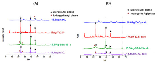 X-ray diffractograms of silver-impregnated adsorbents after I2 adsorption test: (A) samples dried at 80 °C, (B) samples calcined at 500 °C (1 h).