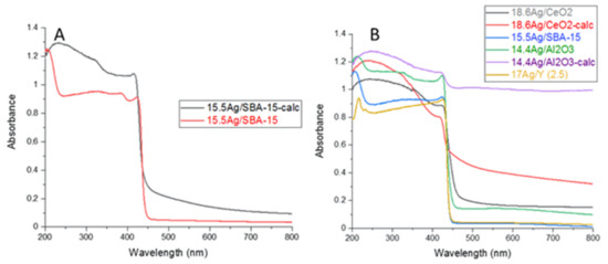 DRS-UV-Vis. DR-UV-Vis spectroscopy was used in order to provide complementary information on the electronic state of silver species incorporated within the investigated supports prior to calcination. According to the literature studies by us and others [14,15,16,17,30,33,34,35], the absorptions relevant to Ag+ cations in different environments are usually found in the range 200–240 nm, whereas the plasmon resonance of silver nanoparticles is responsible of broad absorption bands in the visible region. Other signals are more difficult to assign, but it is generally admitted that charged and metallic clusters (Agnδ+ and Ag°m) yield absorptions at 240–280 nm and 280–350 nm, respectively [14,15,16,17,30,33,34,35].