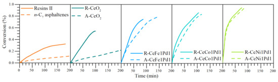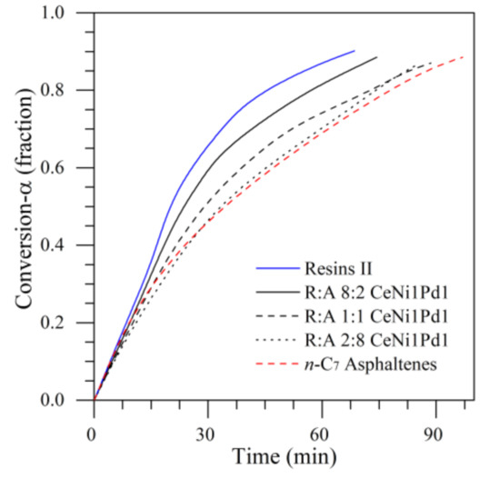 - Nassar, N.N.; Hassan, A.; Luna, G.; Pereira-Almao, P. Kinetics of the catalytic thermo-oxidation of asphaltenes at isothermal conditions on different metal oxide nanoparticle surfaces. Catal. Today 2013, 207, 127–132. [Google Scholar] [CrossRef]