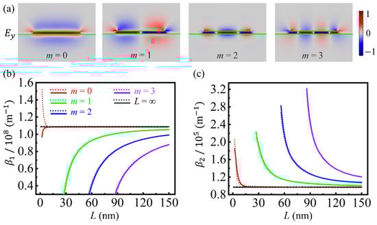 The dependences of real and imaginary parts of β on L are further calculated using both the analytical model and COMSOL Multiphysics, as shown in Figure 2b,c. β1 and β2 of GSPPs supported by infinitely extended double-layer graphene sheets (corresponding to L = ∞) are also provided for comparison, as shown by the black horizontal lines. The cutoff width of the GNR for each mode, Lm, can be predicted by the analytical model (see Supplementary Materials C), where β1 and β2 tend to 0 and ∞, respectively. When L < 30 nm, all the high-order GSPPs (m ˃ 0) are cut off. For the fundamental mode (m = 0), β is independent on L in the range of L > 8 nm, which indicates its strong robustness against the width change. When L gets smaller from 8 nm, the fundamental GSPP mode gradually fades, and the edge mode gradually dominates (see Figure S5 in Supplementary Materials E). Thus, there is an obvious deviation between the analytical and simulated results in this range, as shown in Figure 2b, despite the fact that the proposed model is accurate for analyzing the GSPPs. In comparison with the fundamental mode, the complex propagation constants of the higher-order GSPPs are obviously affected by L.