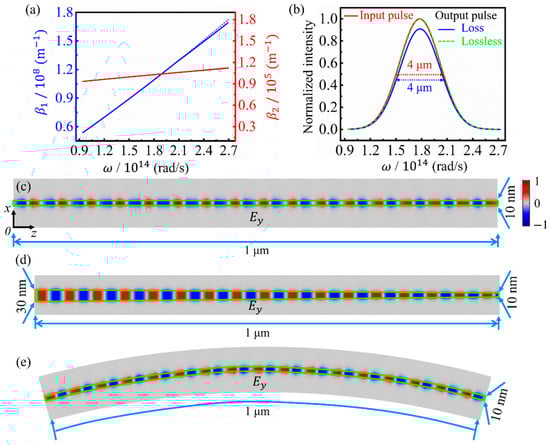 To analyze the robustness of the dispersionless propagation with a deep-subwavelength mode width against the shape change of the GNR, the evolution of a broadband pulse propagating in a GNRGW with a wedge-shaped GNR is simulated. The distribution of Ey indicates that the electromagnetic energy is always confined in the dielectric spacer covered by the GNR, and the mode width varies with L, as shown in Figure 3d. The electric field on the output plane is 1.39 times higher than that on the input plane; thus, the wedge-shaped structure can be used as an effective coupler between wide and narrow GNRGWs. To ignore the field enhancement caused by the focusing, the frequency- and time-domain amplitudes of the output pulse are multiplied by 0.72, as shown by the green dashed line in Figure S8a,b in Supplementary Materials H, and then the envelope profiles of the input and output pulses entirely coincide. Therefore, the dispersionless propagation in the GNRGW exhibits excellent robustness against the width change of the GNR. Furthermore, a GNRGW with a curved GNR is employed to guide the broadband pulse. The distribution of Ey signifies that the electromagnetic energy can still be confined in the dielectric spacer covered by the curved GNR, as shown in Figure 3e. The amplitude of the output pulse is only 0.17% lower than that on the output plane of the straight GNRGW with the same length; thus, the bending loss is negligible. If the frequency- and time-domain amplitudes of the output pulse are multiplied by 1.10 to ignore the loss, as shown in Figure S9a,b in Supplementary Materials H, the envelope profiles completely coincide with those of the input pulse. Thus, the dispersionless propagation is also very robust against the curving of the GNR.