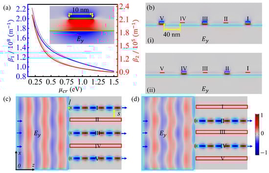 The dependences of the real and imaginary parts of β on the chemical potential of the GNR are further investigated, as shown in Figure 4a. Both β1 and β2 decreases as the chemical potential increases, so the mode characteristics can be adjusted by modifying the gate voltage. β1 is much larger than the wave vector of light in vacuum, corresponding to a deep-subwavelength mode concentration, as shown in the inset of Figure 4a. Therefore, the GNRGWs can be employed as highly integrated photonic devices. Even if the separation between two adjacent GNRs is as small as 40 nm, the GSPPs can still propagate in each channel independently (see Figure S10 in Supplementary Materials I). Moreover, the dependences of β on ε3 and ε5 (see Figure S11 in Supplementary Materials J) indicate that the GSPPs can be guided by various GNRGWs with different spacers and substrates; thus, they are highly compatible with some other planar photonic devices.