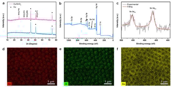 (a) XRD patterns of bare and SnO2-coated Cu foils; (b) wide-range XPS spectrum of SnO2 nanoarray; (c) high-resolution Sn 3d XPS spectrum; and elemental maps of (d) Sn, (e) O and (f) Cu from SnO2 nanoarray.