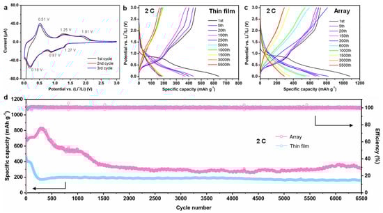 Furthermore, the discharge/charge voltage profiles of SnO2 thin film and SnO2 nanoarray anode are plotted in Figure 3b,c, respectively. During the first discharge process, an apparent characteristic plateau at ~1.0 V (vs. Li/Li+) is found (Figure 3b), which can be attributed to the irreversible occurrence of Equation (1) []. Moreover, a long slope due to the formation of LixSn (Equation (2)) appeared with the further discharge process. The initial specific capacity of SnO2 thin film anode reached ~642 mAh g−1, which decreased to ~400 mAh g−1 and ~200 mAh g−1 after 100 and 250 cycles, respectively. The SnO2 thin film anode rendered a stable specific capacity of ~200 mAh g−1 from 250 to 6500 charge/discharge cycles. These results suggest that the utilization of SnO2 thin film as an anode in LIBs leads to excellent cyclic performance with a moderate specific capacity, which lays a solid foundation for the outstanding performance of SnO2 nanoarray anode. Indeed, as shown in Figure 3c, the discharge/charge plateaus of SnO2 nanoarray anode during the first cycle are located at the same positions as SnO2 thin film. Moreover, the initial discharge capacity of SnO2 nanoarray reached 1082 mAh g−1 and maintained at 700 mAh g−1, 600 mAh g−1 and 300 mAh g−1 after 300, 600, and 1500 charge/discharge cycles, respectively, suggesting a remarkable improvement in electrochemical performance and cyclic stability of SnO2 nanoarray. As presented in Figure S2, the superior electrochemical performance can be attributed to the unique architecture of SnO2, where highly ordered SnO2 nanopillar array provided adequate room for volumetric expansion and ensured structural integrity during the lithiation/delithiation process.