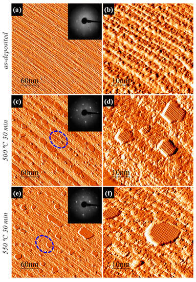 The morphological evolution of the as-deposited Py on the vicinal Si(111) substrate is evident through a series of topographic STM images and LEED patterns in Figure 1. The as-deposited Py film practically buried the substrate surface underneath, to the extent that the traces of the underlying Si(111)-() reconstructed terraces could be barely recognized in STM (Figure 1a,b), and only characteristically a faint () pattern on a milky background appeared in LEED (inset of Figure 1a), evidence of the amorphous nature of the coverage on top of now only bulk-terminated substrate. The (2 2)-reconstructed NDs began to form in the course of a 500 °C anneal, mostly by decorating the surface step-bunch ledges (Figure 1c,d). The milky background in the LEED pattern in the inset of Figure 1c was then replaced by mixed (2 2) + () R30° superlattice diffraction spots (inset of Figure 1c), that became yet clearer and sharper (inset of Figure 1e) after further NDs growth by consumption of dilute Py (Figure 1e,f). We have previously witnessed the formation of a small fraction of () R30°-reconstructed islands within the majority assembly of the (2 2)-reconstructed ones, as a reaction product of pure Fe with Si(111) [17].