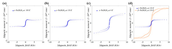 In-plane magnetization reversal loop of grown assembly of γ-Fe(Ni)Si2 NSs measured at (a) 300 K, (b) 150 K and (c) 4 K. Observed loop at 150 K for γ phase is compared with β phase in (d). The displayed magnetic moments have been normalized to reflect the twice larger volume of the as-deposited Py film in the γ-sample in comparison with that used to produce the β-sample in (d).