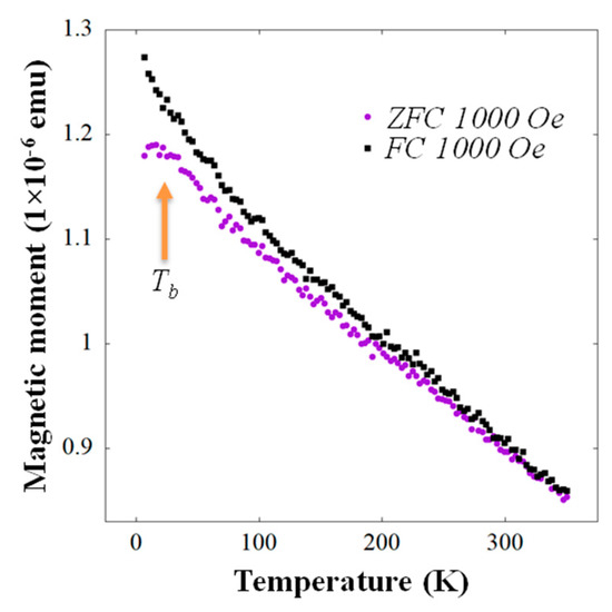 To elucidate the magnetic properties of the self-assembled γ-(FexNi1−x)Si2 NSs shown in Figure 1e,f, we acquired in-plane temperature-dependent magnetization reversal loops, and zero field cooled (ZFC) and field cooled (FC) curves. The systematic increase of the coercive field, saturation magnetic moment, and hysteresis loop area upon the measurement temperature lowering are apparent in Figure 4a–c. For example, the coercive field Hc~72.4 Oe recorded at RT, increased to Hc~104.2 Oe at 150 K, and to Hc~166.0 Oe at 4 K (Figure 4a–c). The ZFC/FC curves indicate the bifurcation point temperature (Tirr) in the vicinity of RT and a blocking temperature Tb at ~30 K (Figure 5), consistent with SPM behavior, where, however, transition to the blocked state for the largest NSs in the assembly takes place already at RT. The onset of transition to the blocked state for the NS distribution mean size was signified by Tb. Such classical SPM behavior of noninteracting NSs is quite different from that in the presence of dipolar (namely SFM or SSG [17,19]) or direct exchange (e.g., ESM) interactions [35]. The magnetization reversal curve of the latter ESM was plotted up to scale, together with the present SPM one in Figure 4d for comparison (both measured at 150 K). Significant differences in the shape and opening of the hysteresis loop, as well as in the value of saturation magnetic moment, are apparent, most notably in the vicinity of the inflection points towards saturation magnetization. Absence of a clear bifurcation Tirr point, and a large temperature gap between the Tirr and Tb, reflect the broad size and shape anisotropy distribution of the NSs in the assembly (cf. Figure 1c,e), and possibly the presence of two different (2 2) and () R30° NS populations.