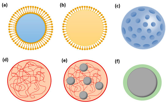 Schematic representation of various nanoparticles: (a) liposome; (b) lipid core nanoparticle; (c) ceramic nanoparticle; (d) polymeric nanoparticle; (e) superparamagnetic iron oxide NP (SPION)-loaded polymeric nanoparticle; (f) coated SPION. Created based on information from literature References [11,12,13,51,83,84,85].