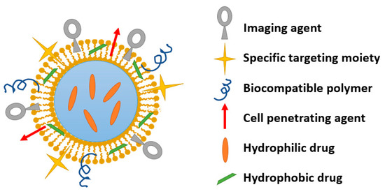 Schematic representation of a multifunctional nanoparticle. Created based on information from literature References [125,126,127,128].