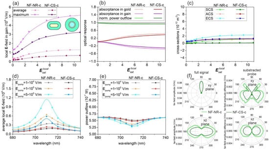 Optical response of NF-NR-c and NF-CS-c optimized nanoresonators: (a) Average and maximum of the enhanced local probe E-field in the gain medium; (b) absorptance in the metal nanorod and shell and in the gain medium and the normalized far-field power outflow; (c) optical cross-sections as a function of normalized pump E-field amplitude. Spectra of the (d) average E-field and (e) normalized power outflow at different normalized pump E-field amplitudes. (f) Polar angle distribution in the far-field at Epump = 5 × 105 V/m. Inset: geometry of NF-NR-c and NF-CS-c nanoresonators. A spline fit was added to the calculated values to guide the eyes and to facilitate the identification of trends.