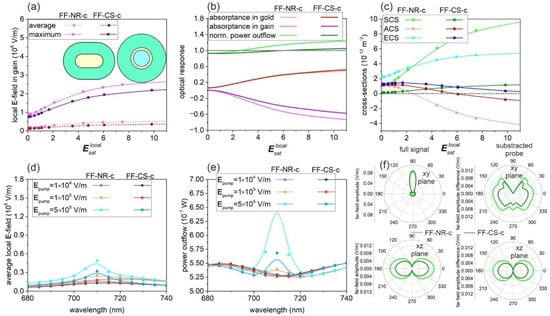 Optical responses of FF-NR-c and FF-CS-c optimized nanoresonators: (a) Average and maximum of the enhanced local probe E-field in the gain medium; (b) absorptance in the metal nanorod and shell and in the gain medium and the normalized far-field power outflow; (c) optical cross-sections as a function of normalized pump E-field amplitude. Spectra of the (d) average E-field and (e) far-field power outflow at different normalized pump E-field amplitudes. (f) Polar angle distribution in the far-field at Epump = 5 × 105 V/m. Inset: geometry of the FF-NR-c and FF-CS-c nanoresonators. A spline fit was added to the calculated values to guide the eyes and to facilitate the identification of trends.