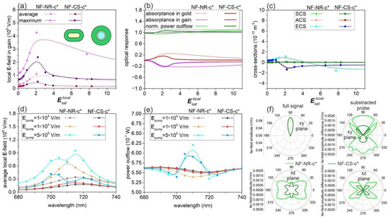 In the far-field response, an enhanced power outflow appears, which reveals that the energy of the probe can be enhanced and outcoupled as well (Figure 3b). This is because the smaller gain is accompanied by an even smaller absorptance in the metal rod (shell), and as a result, the loss is moderated as well. However, in NF-NR-c*, this outcoupling occurs at a larger pump than in FF-NR-c, and the outcoupled power remains smaller. In contrast, in NF-CS-c*, the outcoupling arises at a smaller pump than in FF-CS-c, and its amplitude reaches larger values. In NF-NR-c* and NF-CS-c*, the initial values of power outflow are similar, but in the case of NF-CS-c*, it begins to increase earlier and faster. The outcoupling is achieved at a considerably smaller pump ( = 1.24) in NF-CS-c* than in NF-NR-c* ( = 4.29); however, the maximal outcoupled power reached in NF-CS-c* at ( = 2.2) is almost equal to that in NF-NR-c* at = 7.7 (Figure 3b, Table S1).