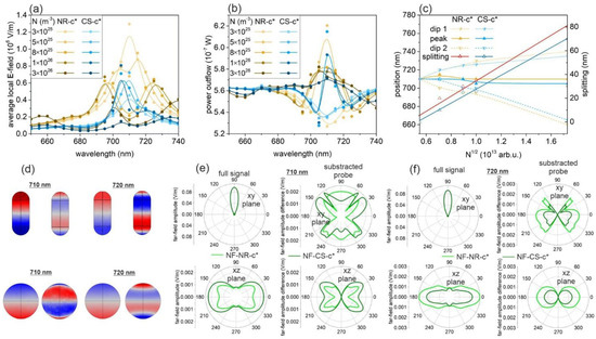 Effect of the dye concentration modification: (a) averaged E-field and (b) far-field power outflow spectra at different normalized pump E-field amplitudes. (c) Peak and dip positions and dip splitting as a function of dye concentration. (d) Charge distribution and (e,f) far-field polar diagram at the (d,e) central peak (710 nm) and (d,f) one of the dips, in the case of 5 × 1025 m−3 and 8 × 1025 m−3 dye concentration and a pump intensity of 5 × 105 V/m and 3 × 105 V/m for NF-NR-c* and NF-CS-c*, respectively. A spline fit was added to the calculated values to guide the eyes and to facilitate the identification of trends.