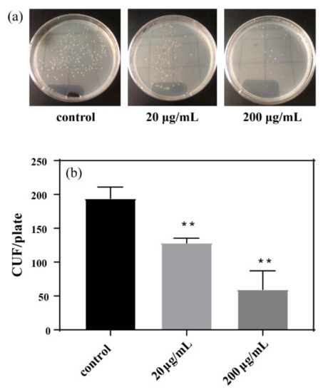The result of bacteriostatic experiments after 24 h of culture (a) and the count of plaque of E. coli (b) (The initial E. coli solution OD600 is 0.1) (** p < 0.01).