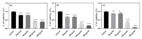 Survival rates of E. coli exposed to GORs in different concentrations at 24 h (a), 48 h (b), and 72 h (c) (** p < 0.01, *** p < 0.001 and **** p < 0.0001).