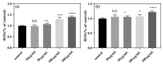 Reactive oxygen species (ROS) produced by cells can react with unsaturated fatty acids to form lipid peroxidase, which can gradually decompose into a series of complex compounds, including malondialdehyde (MDA) [22]. Hence, the level of lipid oxidation can be indirectly determined by measuring MDA content. At high temperatures, MDA can react with thiobarbituric acid to form the reddish-brown trimethanol (3,5,5-trimethyl 2,4-dione), which has an absorption peak at 532 nm [23].