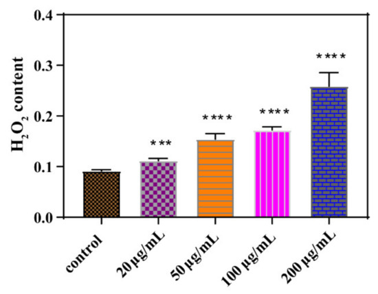 Similarly, as shown in Figure 6, H2O2 content produced by E. coli increased after 24 h exposure to GORs at increasing concentrations. This result is consistent with that of the MDA experiment, suggesting that GORs cause cytotoxic effects on E. coli via ROS generation to oxidize the bacterial cell membrane.