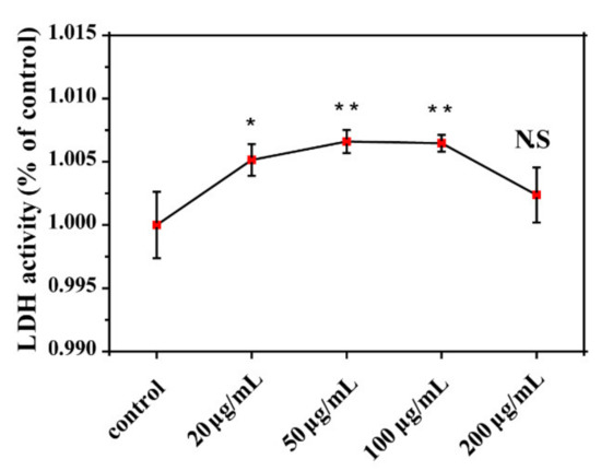 LDH is a cytoplasmic enzyme and is released into the culture medium upon cell membrane damage. Thus, we analyzed LDH levels as an indicator of membrane damage (Figure 7). LDH concentrations slightly increased with GORs concentrations in a range of 0–50 µg/mL, suggesting that higher GORs concentrations induce more cell breakage, which led to more LDH release. However, LDH concentrations gradually decreased with GORs concentrations above 100 µg/mL, which might be due to the excessive dose of GORs inactivated LDH causing the low detection content of LDH in the system. However, the breakage of E. coli was confirmed via a TEM image of E. coli exposed to 200 µg/mL GORs, which was shown in Figure 8d.