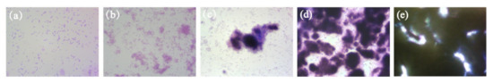 The interaction of GO and its derivatives with microorganisms is complicated. Oxidative stress of E. coli caused by GORs can oxidize the lipid components of the membrane, thereby contributing to further cell damage. Baek et al. found that GO sheet significantly damages E. coli cell membranes due to its sharp edges [1,13], suggesting the mechanical cutting may also be a factor that causes E. coli damage. As seen in the TEM and SEM images, GORs contain sharp edges (Figure 1 and Figure 8a); however, mechanic cutting was not observed even at 200 µg/mL GORs concentration (Figure 8b,c), suggesting that mechanical cutting effect from GORs should be very limited to E. coli in this study. Tu et al. reported that graphene nanosheets can penetrate cell membranes and extract large amounts of phospholipids due to strong dispersion interaction between graphene and lipid molecules [36]. SEM (Figure 1e) and CLSM images of E. coli (Figure 9a) showed that E. coli was evenly distributed in the control groups. However, upon treatment with GORs, E. coli aggregated around the GORs (Figure 9b–e). This was possibly due to the special affinity of GORs to E. coli membrane, resulting in the accumulation of E. coli cells around GORs. This affinity may lead to the adsorption of the membrane components by GORs, thereby increasing their bacteriostatic potency.