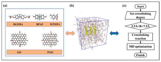 In this study, we used Material Studio 7.0 to complete the modeling and calculation. Firstly, the cross-linking network model of fluorine-containing epoxy resin was constructed, and the DGEBA was fluorinated with hexafluorophobia bisphenol A (BPAF) as a fluorinating agent [8,41]. The monomer molecular models of DGEBA, methyltetrahydrophthalic anhydride (MTHPA), and BPAF were constructed. Each monomer molecule was labeled with reactive atoms and optimized in MD geometry, as shown in Figure 1a. The optimized monomer molecules were put into an amorphous periodic box according to the ratio in Table 1. The box density was set at 0.6 g/cm3, the model temperature was 600 K, and the model was dynamically optimized. Furthermore, graphene unit cells were introduced, and graphene supercells were constructed according to the periodic box size. The molecular model of graphene oxide (GO) monomer was constructed based on Lerf–Klinowski method, and the simplest molecular formula was C10O1(OH)1(COOH)0.5. In the model, epoxy groups and hydroxyl groups are randomly attached to the surface, while carboxyl groups are distributed at the edges. In this paper, a GO sheet containing 82 carbon atoms and 22 oxygen atoms is constructed to represent graphene oxide, and hydrogen atoms are added to prevent unsaturated edges. The GO model is shown in Figure 1a. Then, the graphene oxide is fluorinated, and fluorine atoms are manually added at its edges to construct a FGO model.